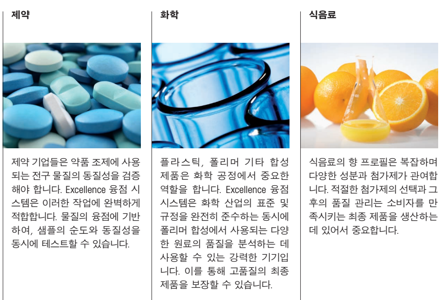 - 첨가제, 유지, 초콜릿 등의 융점 측정을 통한 품질 보증.